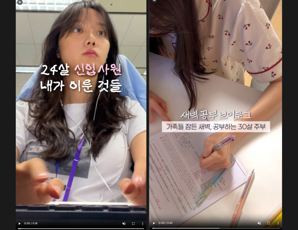 내가 아닌 다른 사람들은 어떻게 살아가는걸까? 갓생사는 직장인 브이로그부터 운동 루틴, 신입사원 일기 브이로그 릴스는 꾸준히 인기예요.